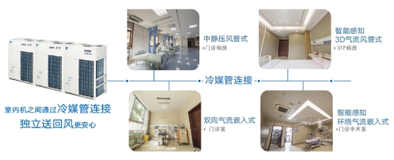 穩(wěn)妥+1:“分區(qū)設(shè)計(jì)”各區(qū)域分工使用 門診、急診、病房住院樓、醫(yī)技樓等,醫(yī)院中央空調(diào)的設(shè)計(jì)根據(jù)醫(yī)院不同區(qū)域/不同功能需求進(jìn)行分割,能夠使各區(qū)域的空氣系統(tǒng)更為獨(dú)立安全。 大金VRV空調(diào)系統(tǒng)自由靈活,高度集成,初期即可按照醫(yī)院區(qū)域分別規(guī)劃設(shè)計(jì),而且每一臺(tái)空調(diào)室內(nèi)機(jī)均可獨(dú)立控制,輕松滿足不同科室/病房的不同使用需求。 1、不同溫度需求