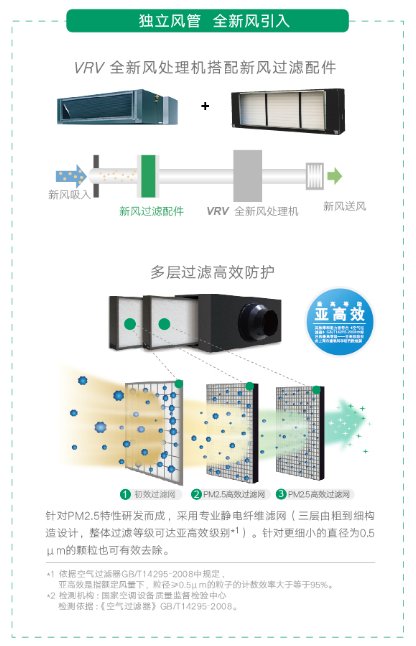 大金VRV全新風(fēng)處理機(jī),獨(dú)立風(fēng)道引入室外新鮮空氣,最大程度避免由于室內(nèi)空氣回風(fēng)混合引起的交叉感染問題,同時(shí)可選配PM2.5過濾網(wǎng)、NO2、SO2過濾網(wǎng),凈化引入的室外空氣中的雜質(zhì)和污染物,在室內(nèi)形成清潔合理的新風(fēng)流動(dòng)場(chǎng)。