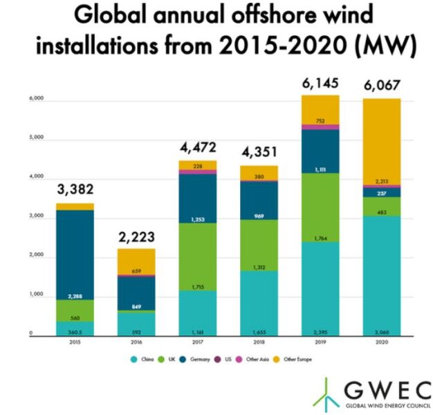 據(jù)全球風(fēng)能理事會(huì)GWEC(Globle Wind Energy,GWEC)最新報(bào)告,2020年,全球新增海上風(fēng)電裝機(jī)容量的一半來自中國。 絲路中心(BRICC)觀察到,海上風(fēng)電已是全球能源投資的熱點(diǎn)產(chǎn)業(yè)。目前海上風(fēng)電發(fā)展目前是什么態(tài)勢?全球資源情況如何?今后將如何發(fā)展?我們應(yīng)該采取什么策略? 本篇文章,絲路中心(BRICC)根據(jù)公開資料對(duì)以上問題進(jìn)行分析,并提出相應(yīng)的工作建議。 文章要點(diǎn) •全球海上風(fēng)電發(fā)展呈現(xiàn)進(jìn)入爆發(fā)期。后續(xù)還會(huì)有越來越多的國家出臺(tái)支持政策,發(fā)展還將加快。中國連續(xù)三年海上風(fēng)電新增裝機(jī)量處于世界領(lǐng)先地位,2020年新增海上風(fēng)電裝機(jī)量超過3GW,占全球增量一半以上。 •中國近年已經(jīng)成為全球海上風(fēng)電發(fā)展的領(lǐng)頭羊,今后還將繼續(xù)加大力度。歐洲國家,韓國、越南等亞洲國家也在持續(xù)發(fā)力。 •全球海上風(fēng)電具有巨大的發(fā)展空間。隨著單機(jī)容量不斷增大、制造和安裝成本的持續(xù)下降,海上風(fēng)電將越來越具備商業(yè)競爭價(jià)值。 •在一些海上風(fēng)電資源豐富的國家,在其政策將明未明之時(shí),及時(shí)搶占資源好的風(fēng)電場并連續(xù)開發(fā),是當(dāng)前海外電力投資的重要方向。 •未來提高競爭力,海上風(fēng)電+儲(chǔ)能、海上風(fēng)電+制氫等模式,也是應(yīng)該考慮的可持續(xù)發(fā)展模式。 1 中國海上風(fēng)電行業(yè)進(jìn)入爆發(fā)期 根據(jù)全球風(fēng)能理事會(huì)(Global Wind Energy Council,GWEC)發(fā)布的最新數(shù)據(jù)顯示,2020年全球海上風(fēng)電新增裝機(jī)量超過6GW,盡管受到新冠疫情影響,但風(fēng)電發(fā)展在能源行業(yè)中保持良好勢頭,成為有史以來第二好的年份,詳見圖1、表1。 總體而言,目前全球海上風(fēng)電裝機(jī)總?cè)萘恳殉^35GW,在過去5年中增長了106%,詳見圖2、表2。