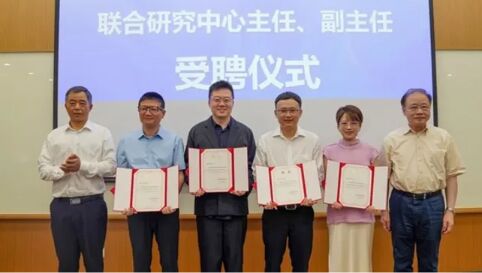 中國科學(xué)院院士馬余剛(左一)、褚君浩(右一)為聯(lián)合研究中心負(fù)責(zé)人頒發(fā)聘書