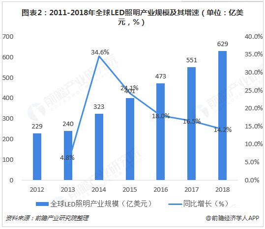 圖表2:2011-2018年全球LED照明產業(yè)規(guī)模及其增速(單位:億美元,%)
