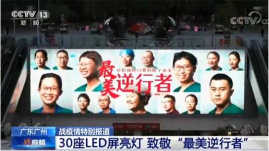 從2月17日開始,廣東廣州中心城區(qū)的30座LED大屏投影出了多幅“最美逆行者”的照片,為奮戰(zhàn)在湖北疫情一線的醫(yī)務(wù)人員送上鼓勵(lì)和祝福。