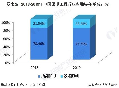 其中,功能性照明目前占主導(dǎo)地位,而景觀(guān)照明的市場(chǎng)份額占比則在逐漸上升。2018年,我國(guó)功能性市場(chǎng)規(guī)模為3408億元,占比約為78.46%;至2019年,功能性照明市場(chǎng)規(guī)模占比下降至77.75%,而景觀(guān)照明市場(chǎng)份額則上升至22.25%。
