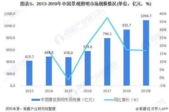 景觀(guān)性照明:市場(chǎng)規(guī)模迅速增長(zhǎng) 進(jìn)入21世紀(jì),科技發(fā)展日新月異,照明工程行業(yè)順應(yīng)節(jié)能環(huán)保的潮流,將高科技照明、節(jié)能照明等技術(shù)逐步應(yīng)用到照明技術(shù)中,同時(shí)隨著電子技術(shù)、光纖和導(dǎo)光管技術(shù)、投影技術(shù)、全息技術(shù)等的迅速發(fā)展及其在夜景照明中的應(yīng)用,城市夜景所用燈具更加豐富,使得我國(guó)景觀(guān)照明工程行業(yè)進(jìn)入高速發(fā)展階段。 如今,我國(guó)已成為最大的景觀(guān)照明市場(chǎng),景觀(guān)照明市場(chǎng)規(guī)模從2013年的415.7億元增長(zhǎng)至2017年的796.1億元,期間年均復(fù)合增長(zhǎng)率達(dá)21.22%。預(yù)計(jì)2019年行業(yè)規(guī)模將超1000億元。