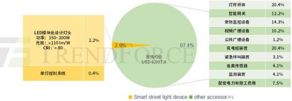 集邦咨詢旗下光電研究處LEDinside最新發(fā)布的《2020全球LED照明市場報告-照明級封裝與照明產(chǎn)品趨勢》數(shù)據(jù)顯示,預(yù)估2024年全球LED智慧路燈市場(智慧路燈市場規(guī)模僅包含燈頭產(chǎn)品和單燈控制系統(tǒng))規(guī)模為 10.94億美金,2019至2024年復(fù)合增長率為8.2%。 集邦咨詢分析師劉玲麗表示,下游LED照明需求與宏觀經(jīng)濟發(fā)展高度相關(guān),盡管疫情帶來的影響存在諸多不確定性,但全球各地政府進行不同程度的財政刺激政策以及新建智慧城市,投資新型基礎(chǔ)設(shè)施,以緩解COVID-19對經(jīng)濟產(chǎn)生的負面影響,尤其在中國和北美地區(qū),道路建設(shè)是其投資支出大項,如,美國政府于2019年道路建設(shè)總體支出金額為976億美金(+6.34%YoY),戶外LED路燈照明將受益于此。LED路燈照明廠商包括Signify、AcuityBrands、Zumtobel、光林 (光寶集團旗下照明品牌) 與洲明科技等近2年持續(xù)不斷地推出戶外智慧照明新品和整體解決方案,將加速智慧路燈市場滲透。 從智慧路燈項目建設(shè)成本角度來看,集邦咨詢表示,廣義來說, 智能燈桿主要包含6大核心功能:1)智慧照明; 2)信息發(fā)布; 3)安防監(jiān)測; 4)環(huán)境檢測; 5)充電樁; 6)5G微基站平臺。在其功能配件中,智能照明設(shè)備為100%標配產(chǎn)品,包含LED模塊化設(shè)計燈頭和單燈控制器。據(jù)集邦咨詢走訪調(diào)研,最高配備(選配)智能燈桿市場均價為6,997.9美金,其中智能照明設(shè)備市場均價為182.5美金,占比2.6%。