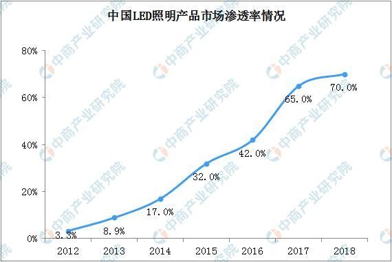 從滲透率來看,中國是LED照明產(chǎn)品最大的生產(chǎn)制造國,根據(jù)國家半導(dǎo)體照明工程研發(fā)及產(chǎn)業(yè)聯(lián)盟(CSA)的統(tǒng)計,中國LED照明產(chǎn)品國內(nèi)市場滲透率(LED照明產(chǎn)品國內(nèi)銷售數(shù)量/照明產(chǎn)品國內(nèi)總銷售數(shù)量)由2012年的3.3%快速提升至2018年的70%,遠(yuǎn)超全球平均水平。