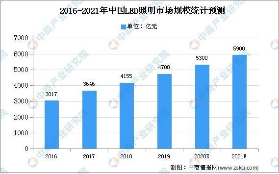 從市場規(guī)模來看,隨著國內(nèi)LED照明市場滲透率快速攀升至七成以上,LED照明已基本成為照明應(yīng)用的剛需,國內(nèi)的LED照明市場規(guī)模呈現(xiàn)出較全球平均水平更快的增長勢頭。數(shù)據(jù)顯示,中國LED照明市場產(chǎn)值規(guī)模由2015年的2596億元增長到2018年的4155億元,年均復(fù)合增長率達(dá)到16.97%,增速高于全球平均水平。預(yù)計到2021年,中國LED照明市場產(chǎn)值有望達(dá)到5900億元,2019-2021年仍有望能保持超過12%的年均復(fù)合增長水平。