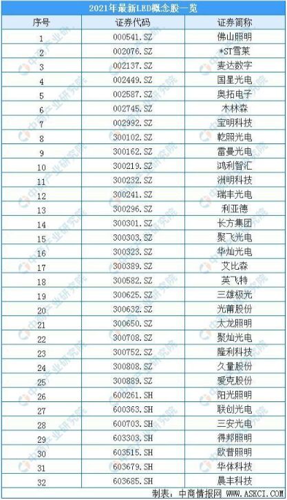 從相關(guān)概念企業(yè)來看,截至2021年1月13日,LED概念企業(yè)主要有以下32家:
