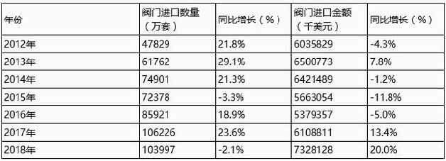 閥門作為重大技術(shù)裝備的重要組成部分,在石油、化工、冶金、長輸管線、核電、城市供排水系統(tǒng)等國民經(jīng)濟各部門中起著關(guān)鍵作用。據(jù)中國海關(guān)發(fā)布的數(shù)據(jù)顯示,2018年1-12月,我國進口閥門103997萬套,同比下降2.1%;1-12月我國閥門進口金額為7328128千美元,同比增長20%。
