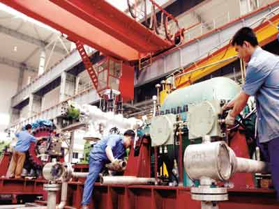 這臺風(fēng)機的研制,通風(fēng)公司歷經(jīng)了近一年半的艱辛,取得了技術(shù)上的多項突破。研發(fā)核心部件——風(fēng)機轉(zhuǎn)子時,設(shè)計部門大膽挑戰(zhàn)引進技術(shù)的權(quán)威:通過采取反復(fù)計算設(shè)計參數(shù)、改變設(shè)計思路和設(shè)計理念等手段,將德國技術(shù)方案中的軸承數(shù)由5個減少為3個;將滾柱軸承和角接觸軸承改為球面滾子推力軸承,降低了零件的加工難度,并極大地降低了制造成本(僅軸承費用一項就為公司節(jié)省近90萬元)。此外,生產(chǎn)、工藝等部門還與設(shè)計部門緊密協(xié)作,通過改進工藝方法、減少板材厚度、重新設(shè)計相關(guān)部件等手段,將風(fēng)機主體重量控制在30噸以下,從而實現(xiàn)了風(fēng)機主體部分的整體運輸,既能節(jié)約生產(chǎn)、運輸成本,又能減少客戶在現(xiàn)場的安裝量。 “三爐塔合一”引風(fēng)機的研制成功,標志著沈鼓集團在風(fēng)機領(lǐng)域?qū)崿F(xiàn)了又一重大的技術(shù)突破,不僅為企業(yè)拓展國內(nèi)同類風(fēng)機市場提供了業(yè)績和技術(shù)的支撐,而且為企業(yè)平穩(wěn)較快發(fā)展創(chuàng)造了新的經(jīng)濟增長點。這種類型的產(chǎn)品填補了600MW機組雙級引風(fēng)機完全國產(chǎn)化的空白,續(xù)寫了國家重大技術(shù)裝備國產(chǎn)化的新篇章。