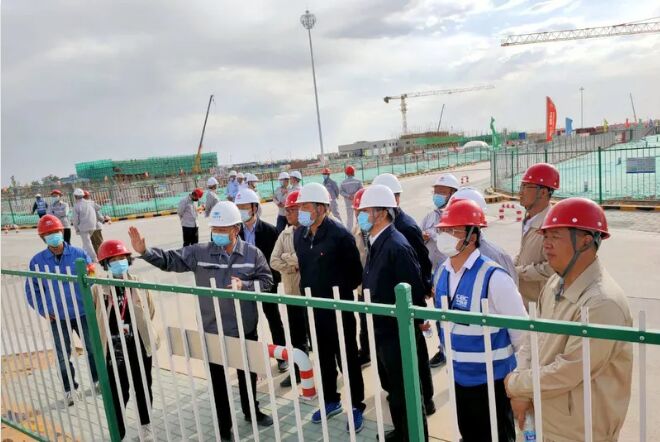 國電電力集團(tuán)領(lǐng)導(dǎo)到國電雙維電廠現(xiàn)場檢查工作,劉國銀總經(jīng)理在現(xiàn)場介紹雙良的鋼塔項目。