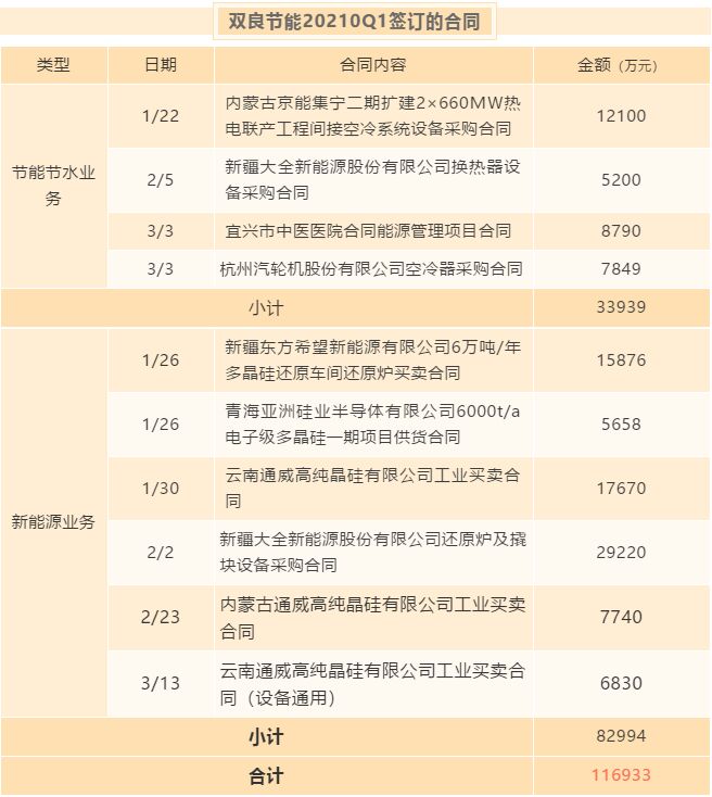 4月19日,雙良節(jié)能發(fā)布了2021年一季度報告,公告顯示,一季度實(shí)現(xiàn)營業(yè)收入4.34億元,同比增長97.37%;凈利潤2742萬元,同比增長198.98%。利潤增長主要系公司強(qiáng)化精細(xì)化管理,增強(qiáng)市場意識,抓住了市場機(jī)遇,有效地提升了企業(yè)經(jīng)營業(yè)績。 一季度業(yè)績創(chuàng)近五年新高 雙良節(jié)能一季報顯示,實(shí)現(xiàn)營業(yè)收入4.34億元,同比增長97.37%;凈利潤2742萬元,同比增長198.98%。與此同時,2021年一季度與2019年一季度相比,營收增長24%,凈利潤增長達(dá)161%。 隨著疫情的緩解,雙良節(jié)能業(yè)務(wù)改善非常明顯,這也一定程度上表明了公司不僅經(jīng)營快速恢復(fù),而且其戰(zhàn)略規(guī)劃、產(chǎn)品、模式上的轉(zhuǎn)型也取得了突破性的進(jìn)展。今年一季度營收和凈利潤均創(chuàng)近五年的新高,給市場交出了一份令人驚喜的成績單。 節(jié)能減排和新能源齊頭并進(jìn) 近期,雙良節(jié)能頻頻公告大額訂單,從溴化鋰熱泵到空冷系統(tǒng),再到多晶硅還原爐,從余熱利用到循環(huán)水冷卻,再到光伏新能源,無一不是在助推“碳達(dá)峰、碳中和”目標(biāo)的實(shí)現(xiàn),而“碳達(dá)峰、碳中和”政策也將進(jìn)一步提升節(jié)能減排和光伏新能源的業(yè)務(wù)需求。 數(shù)據(jù)顯示,公司自2020年起公告的訂單合同累計近33億元。其中,今年一季度公告的訂單合同金額高達(dá)11.69億元,一季度節(jié)能節(jié)水業(yè)務(wù)占3.39億元;一季度新能源業(yè)務(wù)占8.30億元。 這意味著,雙良節(jié)能基本實(shí)現(xiàn)了雙輪驅(qū)動,節(jié)能減排和新能源兩大板塊業(yè)務(wù)齊頭共進(jìn)。隨著交付緊密期的臨近、經(jīng)營旺季的來臨,未來公司的業(yè)績將明顯得到提升。