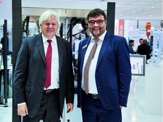 *Plasmatreat 公司 CEO Christian Buske(右)和德國(guó)倍福自動(dòng)化有限公司總裁(左)對(duì)基于 XPlanar 的等離子處理裝置在 2019 年德國(guó)杜塞爾多夫橡塑展 K 展上的成功亮相感到高興