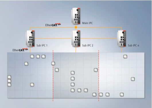 使用 XPlanar 并行計算功能可以將整個系統(tǒng)分為多個子系統(tǒng),每個子系統(tǒng)由一臺子工業(yè) PC 控制,以實現(xiàn)規(guī)模超大的 XPlanar 模塊化系統(tǒng)。這樣就能夠?qū)⒂嬎忝芗腿蝿?wù)最優(yōu)分配給相應(yīng)的系統(tǒng)部分。子工業(yè) PC 間的通信確保兩個子系統(tǒng)之間動子的高動態(tài)切換,而上位主工業(yè) PC 則用于控制整個系統(tǒng)的運行。作為中央控制器,它還負責應(yīng)用程序的編寫以及系統(tǒng)的診斷,換句話說,常用的 TwinCAT 3 XPlanar(TF5890)功能都可以在其上運行。此外,既不需要從應(yīng)用程序訪問下一級的子工業(yè) PC,也不需要在分段切換時轉(zhuǎn)移動子,使得應(yīng)用程序的創(chuàng)建和系統(tǒng)操作與以前一樣簡單。