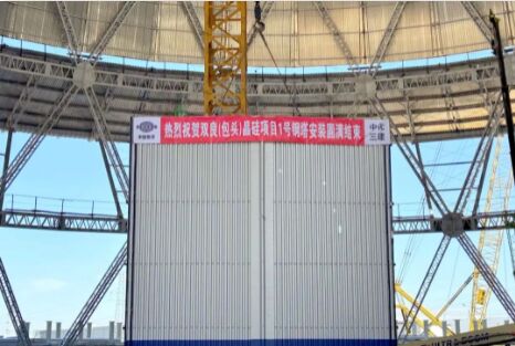 8月22日,在內(nèi)蒙古包頭的雙良新能源光伏產(chǎn)業(yè)園三期50GW單晶硅項目(簡稱“三期項目”)建設(shè)現(xiàn)場,隨著頂部最后一塊蒙皮吊裝完成鋼塔合攏,三期項目1號、2號全鋼結(jié)構(gòu)間冷塔順利封頂,為三期項目早日投產(chǎn)奠定了堅實的基礎(chǔ)。
