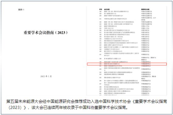 第五屆未來能源大會經(jīng)中國能源研究會推薦成功入選中國科學(xué)技術(shù)協(xié)會《重要學(xué)術(shù)會議指南(2023)》,該大會已連續(xù)兩年被收錄于中國科協(xié)重要學(xué)術(shù)會議指南。