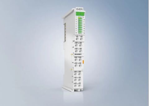 EtherCAT 端子模塊 EL4374 將可參數(shù)化的模擬量輸入和輸出結(jié)合在一個(gè)緊湊的、帶 LED 信號指示燈的高密度外殼中