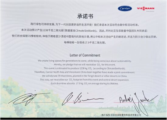 “本次活動(dòng)預(yù)計(jì)產(chǎn)生1238千克二氧化碳 (數(shù)據(jù)基準(zhǔn)ClimateSteWards)。 因此, 開利北亞及菲斯曼中國(guó)團(tuán)隊(duì)共同承諾: