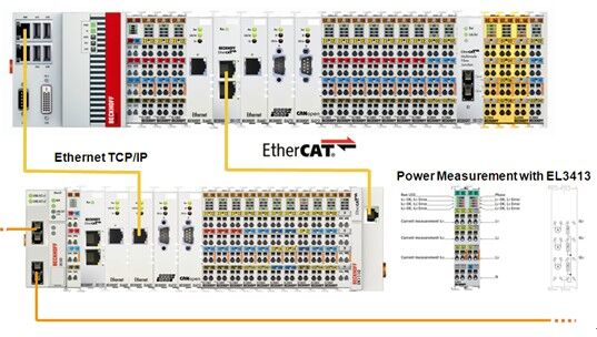 該方案采用了倍福嵌入式工業(yè) PC CX5020控制器作為風(fēng)機(jī)的主控制器,主控制程序基于TwinCAT軟件,運用倍福自主開發(fā)完善、高效、成熟的風(fēng)電專用功能庫,集成先進(jìn)的控制算法,很好的協(xié)調(diào)控制風(fēng)機(jī)各部件和子系統(tǒng)的運行。根據(jù)當(dāng)前的風(fēng)況和風(fēng)電場能量管理平臺的控制指令,控制風(fēng)機(jī)的輸出電壓、頻率和功率等等,保證風(fēng)機(jī)的穩(wěn)定運行。 風(fēng)機(jī)控制器可以通過 EtherCAT網(wǎng)橋模塊EL6695和擴(kuò)展模塊EK1110 接入風(fēng)電場實時控制網(wǎng)絡(luò),與能量管理平臺進(jìn)行通訊,滿足對整個風(fēng)電場的實時控制的需要。EK1501作為單臺風(fēng)機(jī)與風(fēng)電場EtherCAT實時網(wǎng)絡(luò)的接入點。 EL3413 模塊可直接監(jiān)測單臺風(fēng)機(jī)并網(wǎng)側(cè)的690 V AC電壓、電流、頻率、有功、無功、發(fā)電量,以及21次以內(nèi)的諧波等等。風(fēng)機(jī)主控系統(tǒng)通過采集的電力數(shù)據(jù)監(jiān)測風(fēng)機(jī)運行狀況、相關(guān)的數(shù)據(jù)可通過風(fēng)場網(wǎng)絡(luò)傳送到風(fēng)電場中控室的能量管理平臺和 SCADA系統(tǒng)。 b) 風(fēng)電場控制器及公共并網(wǎng)點電力監(jiān)測,如下圖4所示