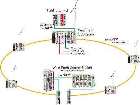 b) 風(fēng)場的動態(tài)無功支撐能力 總裝機(jī)容量在百萬千瓦級規(guī)模及以上的風(fēng)電群,當(dāng)電力系統(tǒng)發(fā)生三相短路故障引起電壓跌落時,每個風(fēng)電場在低電壓穿越過程中應(yīng)具有以下動態(tài)無功支撐能力:當(dāng)風(fēng)電場并網(wǎng)點電壓處于標(biāo)稱電壓的20%~90%區(qū)間內(nèi)時,風(fēng)電場應(yīng)能夠通過注入無功電流支撐電壓恢復(fù),所需的無功電流取決于電壓跌落的深度且必須取決于風(fēng)力發(fā)電機(jī)組或電網(wǎng)并網(wǎng)點的要求;子并網(wǎng)點電壓跌落出現(xiàn)的時刻起,動態(tài)無功電流控制的響應(yīng)時間不大于75ms,持續(xù)時間應(yīng)不小于550ms。 1.2 現(xiàn)有風(fēng)電場網(wǎng)絡(luò)存在的問題 現(xiàn)有風(fēng)電場網(wǎng)絡(luò)存在的不足主要有兩個:①控制周期慢;②無法協(xié)調(diào)整個風(fēng)電場內(nèi)的風(fēng)機(jī)達(dá)到風(fēng)場級別LVRT功能。 現(xiàn)有的風(fēng)電場網(wǎng)絡(luò)是基于以太網(wǎng)的解決方案,通訊采用以太網(wǎng)光纖,風(fēng)機(jī)處使用普通以太網(wǎng)交換機(jī),風(fēng)場集控系統(tǒng)與各個風(fēng)機(jī)之間采用TCP/IP等非實時的通訊協(xié)議。由于交換機(jī)的延時和以太網(wǎng)報文的不確定性,使得整個風(fēng)電場控制網(wǎng)絡(luò)是“秒級”或者更長的時間,通訊速度和通訊的實時性無法保證。 現(xiàn)有風(fēng)機(jī)的LVRT檢測和實現(xiàn)都是在風(fēng)機(jī)本身的變流器部分實現(xiàn),根據(jù)要求新增的風(fēng)力發(fā)電機(jī)組都必須具備低電壓穿越能力。然而,考慮到風(fēng)場規(guī)模的增大,以及每臺風(fēng)機(jī)的不同情況,根據(jù)單個風(fēng)機(jī)監(jiān)測的電壓情況作出的反應(yīng)也許不能產(chǎn)生電網(wǎng)營運商預(yù)期的效果。由于風(fēng)力發(fā)電機(jī)組與電網(wǎng)并網(wǎng)點之間存在的阻抗,所以它們之間的電壓會有差異。也就是說各個風(fēng)力發(fā)電機(jī)組對公共并網(wǎng)點電壓的變化會做出不同的反應(yīng)。同樣,風(fēng)力發(fā)電機(jī)組級饋入的無功電流與電網(wǎng)并網(wǎng)點的最終無功電流也是不一致的。即無法達(dá)到國家標(biāo)準(zhǔn)對整個風(fēng)電場整體的低電壓穿越的要求。 1.3 EtherCAT風(fēng)場控制網(wǎng)絡(luò)解決方案 永磁直驅(qū)風(fēng)力發(fā)電機(jī)和雙饋異步風(fēng)力發(fā)電機(jī)是目前使用最多的風(fēng)力發(fā)電機(jī)類型,與傳統(tǒng)的恒速恒頻風(fēng)力發(fā)電機(jī)相比,和功率因數(shù)可在+0.95到-0.95之間調(diào)整,可以在一定的范圍內(nèi)調(diào)整輸出的有功和無功功率,其無功調(diào)節(jié)能力也廣泛地應(yīng)用于風(fēng)電場的無功調(diào)整。充分發(fā)揮風(fēng)力發(fā)電機(jī)自身的無功支撐能力,并以遠(yuǎn)端并網(wǎng)點母線電壓為控制目標(biāo),對維持電網(wǎng)的無功功率平衡和電壓穩(wěn)定有著十分重要的意義。來自德國弗勞恩霍夫風(fēng)能及能源系統(tǒng)技術(shù)研究院的Melanie Hau 和Martin Shan [2]的研究表明,風(fēng)場監(jiān)控網(wǎng)絡(luò)的速度以及風(fēng)電機(jī)組自動控制系統(tǒng)現(xiàn)場總線的速度對風(fēng)場電壓或無功功率控制可實現(xiàn)的動態(tài)性產(chǎn)生了顯著影響。 而這恰恰就是 EtherCAT 風(fēng)場控制網(wǎng)絡(luò)解決方案的優(yōu)點。迄今為止,風(fēng)場網(wǎng)絡(luò)監(jiān)控都是使用以太網(wǎng)實現(xiàn)的。以太網(wǎng)光纜用于將單獨的風(fēng)力發(fā)電機(jī)組連接到主計算機(jī)。因為 EtherCAT 基于以太網(wǎng),所以其與以太網(wǎng)的物理層完全兼容。當(dāng)使用EtherCAT時,也可應(yīng)用相同的物理層。此外,EtherCAT 還完全實現(xiàn)了線纜冗余。風(fēng)場中的光纜環(huán)網(wǎng)通過風(fēng)場主機(jī)的第二塊網(wǎng)卡形成閉環(huán)。亮點就在于,與目前使用的支持冗余的交換機(jī)相比,使用EtherCAT可以顯著提高傳輸速度并降低成本。 與目前的其它方案不同,EtherCAT 解決方案可以利用EtherCAT使整個風(fēng)場應(yīng)對低電壓穿越(LVRT)。因此,如果在風(fēng)電場并網(wǎng)點診斷出有電壓跌落,它可以在1 ms的時間內(nèi)將信號傳輸給整個風(fēng)場的所有風(fēng)力發(fā)電機(jī)組。且其能夠讓整個風(fēng)場對電網(wǎng)中的電壓跌落做出協(xié)同的反應(yīng)。這樣,解決方案即可實現(xiàn)整個風(fēng)場在電網(wǎng)并網(wǎng)點的確定的行為。 另外,EtherCAT從站中的分布式時鐘能夠確保整個網(wǎng)絡(luò)中的數(shù)據(jù)采樣在時間上保持同步。時基誤差小于1μs(微秒),甚至小于100 納秒。有了這些數(shù)據(jù),電流、電壓和頻率可以得到相應(yīng)控制且電網(wǎng)可以得到最優(yōu)的支持。 2.倍福極速風(fēng)電場監(jiān)控網(wǎng)絡(luò) 倍福極速風(fēng)電場監(jiān)控網(wǎng)絡(luò)方案如下圖2所示。 該方案是基于倍福的工業(yè)PC、電力測量端子模塊、帶光纖接口的EtherCAT耦合器和實時的EtherCAT通訊技術(shù)、超采樣技術(shù)、EtherCAT分布式時鐘技術(shù)。倍福工業(yè)PC上運行專用的風(fēng)電場能量管理平臺,具有強(qiáng)大的風(fēng)電場實時電力監(jiān)控功能。該平臺提供與電網(wǎng)調(diào)度接口,集中實時控制風(fēng)電場并網(wǎng)