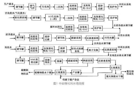 中安180萬(wàn)m3/年煤制烯烴項(xiàng)目是由中國(guó)石化和皖北煤電各出資50%建立的煤化工企業(yè)。該項(xiàng)目地處淮河流域,環(huán)境影響敏感,環(huán)評(píng)及批復(fù)要求本項(xiàng)目污水全部回用不得外排。主要工藝單元有煤氣化、變換、低溫甲醇洗、硫磺回收、甲醇制烯烴(MTO)、聚丙烯(PP)、聚乙烯(PE)等裝置,配套公用工程單元有凈水場(chǎng)、循環(huán)水場(chǎng)、動(dòng)力站、化水站、凝結(jié)水回收單元、配套罐區(qū)、火炬等設(shè)施。處理的廢水主要為煤氣化廢水、煤制烯烴排水及下游化工裝置,公用工程單元排水。總體設(shè)計(jì)階段廢水近零排放技術(shù)方案采用蒸發(fā)結(jié)晶產(chǎn)混鹽方案,2014年基礎(chǔ)設(shè)計(jì)審查時(shí),業(yè)主首次提出廢水分鹽近零排放思路,減少混鹽作為固體廢物外排量,處理后廢水全部回用至循環(huán)水場(chǎng)或化水站,蒸發(fā)結(jié)晶產(chǎn)出硫酸鈉、氯化鈉資源化利用,少量雜鹽外運(yùn)。當(dāng)時(shí)國(guó)內(nèi)廢水近零排放分鹽技術(shù)尚處在一個(gè)起步階段,國(guó)外此類(lèi)技術(shù)需求較少,市場(chǎng)上缺少成熟技術(shù),煤化工廢水直接分鹽近零排放缺少成熟的工業(yè)化應(yīng)用案例,部分新建和在運(yùn)煤化工企業(yè)剛剛開(kāi)始關(guān)注廢水近零排放分鹽技術(shù)路線(xiàn)。2017年底決定立足自主研發(fā),組建了由設(shè)計(jì)單位:中國(guó)石化工程建設(shè)有限公司(SEI)、研究單位:北京化工研究院和大連石油化工研究院,業(yè)主單位:中安聯(lián)合共同組成的“十條龍科研攻關(guān)”課題組,在SEI提出的工藝流程基礎(chǔ)上共同開(kāi)發(fā)煤化工廢水近零排放分鹽技術(shù),最終形成中石化自有知識(shí)產(chǎn)權(quán)工藝包,并在中安項(xiàng)目配套污水處理場(chǎng)實(shí)現(xiàn)近零排放分鹽技術(shù)的工業(yè)化應(yīng)用。