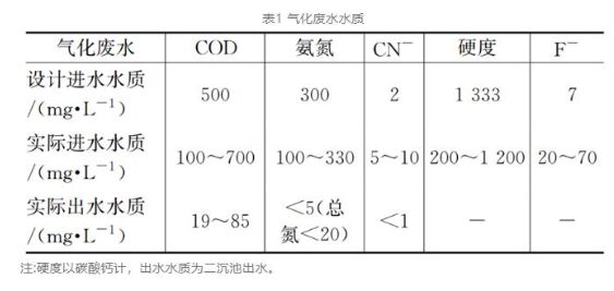 中安煤氣化裝置共設(shè)置7臺(tái)1 500m3/d氣化爐(5用2備),采用中石化東方爐粉煤氣化工藝,廢水設(shè)計(jì)排放量正常315m3/h最大375m3/h 設(shè)計(jì)水質(zhì)COD 500mg/L 氨氮300mg/L 硬度1 333mg/L(以碳酸鈣計(jì)),堿度1 624mg/L(以碳酸鈣計(jì)),CN- 1mg/L,F- 7mg/L。中安項(xiàng)目氣化裝置開(kāi)車(chē)后,由于項(xiàng)目配套煤礦未達(dá)產(chǎn),需從內(nèi)蒙、山西、河南等多地調(diào)煤,以保證氣化裝置連續(xù)生產(chǎn)用煤。項(xiàng)目運(yùn)行第一年氣化裝置煤種切換17次,氣化裝置進(jìn)料配煤方案達(dá)10余種。每次氣化裝置煤種變化,均會(huì)對(duì)氣化廢水水質(zhì)產(chǎn)生或多或少的影響。針對(duì)氣化廢水水質(zhì)波動(dòng)較大的特點(diǎn),中安項(xiàng)目設(shè)置了廢水暫存罐區(qū)用于事故工況污水暫存。污水場(chǎng)在氣化廢水來(lái)水管道上設(shè)置氨氮、COD等在線(xiàn)監(jiān)測(cè)儀表,來(lái)水水質(zhì)超標(biāo)時(shí)切換至廢水暫存罐儲(chǔ)存,待系統(tǒng)平穩(wěn)后,再回送污水場(chǎng)處理。氣化廢水硬度較高,為保證后續(xù)生化處理效果,氣化廢水先經(jīng)除硬后再送入調(diào)節(jié)罐進(jìn)入后續(xù)生化處理構(gòu)筑物。本項(xiàng)目設(shè)計(jì)氣化廢水水質(zhì)為負(fù)硬度水,采用雙堿法軟化澄清工藝除硬。針對(duì)本項(xiàng)目氣化廢水氨氮高,有機(jī)物難降解的特點(diǎn),SEI聯(lián)合大連化工研究院,基于茂名石化氣化廢水現(xiàn)場(chǎng)試驗(yàn)開(kāi)發(fā)了煤氣化廢水五廊道兩級(jí)AO工藝,利用項(xiàng)目自產(chǎn)甲醇作為碳源實(shí)現(xiàn)低COD高氨氮廢水的反硝化處理。氣化廢水實(shí)際運(yùn)行水質(zhì)見(jiàn)表1。