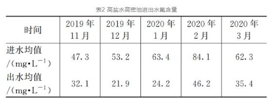 從實(shí)際運(yùn)行數(shù)據(jù)可以看出,僅管氣化廢水水質(zhì)波動(dòng)較大,但COD和氨氮處理效果相對(duì)較好,處理后出水氨氮最低可小于1mg/L。實(shí)際來(lái)水CN-和F-高于設(shè)計(jì)值,硬度低于設(shè)計(jì)值,這3個(gè)指標(biāo)的變化均與煤種和配煤方案有較大的關(guān)系。CN-的生成與氣化溫度有關(guān),中安氣化爐為粉煤氣化屬于高溫氣化工藝,氣化溫度>1 500℃,碳和氮在高溫下易發(fā)生反應(yīng),生成CN-。氣化污水CN-雖高于設(shè)計(jì)值,但小于10mg/L,如在進(jìn)生化前采用氧化破氰預(yù)處理,氧化劑投加后不一定作用于氰根離子,大概率會(huì)與有機(jī)污染物反應(yīng)。考慮到氰根離子未超過(guò)10mg/L,項(xiàng)目組采用提高生化系統(tǒng)氰根耐受性的方式處理氰根,通過(guò)逐步提高生化池進(jìn)水CN-,適當(dāng)加大生化池污泥回流量和硝化液回流量的方法馴化污泥,逐步提高系統(tǒng)對(duì)CN-的耐受性,經(jīng)過(guò)近3個(gè)月的馴化,二沉池出水CN-可穩(wěn)定小于0.5mg/L。氣化廢水中的F-主要與煤里氟的含量有關(guān),由于運(yùn)行煤種的變化造成F-來(lái)水超標(biāo),F(xiàn)-對(duì)蒸發(fā)結(jié)晶系統(tǒng)中的鈦材有一定的腐蝕性,考慮到中安廢水處理流程中并未設(shè)置單獨(dú)除F-設(shè)施,且由于現(xiàn)場(chǎng)占地緊張,無(wú)法新增除氟設(shè)施,只能利用現(xiàn)有除硬、除硅設(shè)施同步除氟。除氟、除硬、除硅的協(xié)同處理首先通過(guò)兩家研究單位實(shí)驗(yàn)室研究反應(yīng)機(jī)理,再通過(guò)現(xiàn)場(chǎng)調(diào)整操作運(yùn)行解決。除氟、除硬、除硅最適宜的反應(yīng)條件及pH均不同,通過(guò)實(shí)驗(yàn)室和現(xiàn)場(chǎng)測(cè)定,適當(dāng)調(diào)整反應(yīng)pH、加藥量對(duì)除氟有一定的協(xié)同去除效應(yīng),F(xiàn)場(chǎng)根據(jù)研究結(jié)論摸索、調(diào)整運(yùn)行操作,利用現(xiàn)有高鹽水除硬、除硅設(shè)施可同步達(dá)到30%~50%的除氟效率。系統(tǒng)中氟離子未完全去除,各段出水常年保有一定的氟離子含量,項(xiàng)目運(yùn)行近2年來(lái),后續(xù)蒸發(fā)結(jié)晶系統(tǒng)材料并未出現(xiàn)大面積腐蝕,在整個(gè)近零排放系統(tǒng)中F-的腐蝕性可控,見(jiàn)表2。