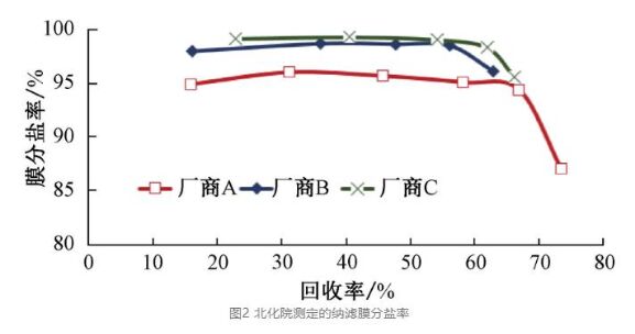 納濾膜最初開(kāi)發(fā)目的并非分離一、二價(jià)離子,對(duì)納濾膜的篩選顯得至關(guān)重要,通過(guò)研究單位對(duì)市面上主流廠商的納濾膜做了實(shí)驗(yàn)室標(biāo)定,證明主流廠商納濾膜在實(shí)驗(yàn)室條件下均可實(shí)現(xiàn)一、二價(jià)離子的有效分離(見(jiàn)圖2)。項(xiàng)目實(shí)際運(yùn)行后納濾膜對(duì)一、二價(jià)離子進(jìn)行了有效地分離,同時(shí)屏蔽了淮河水水質(zhì)波動(dòng)可能造成的離子變化,濃水側(cè)以硫酸根離子為主,產(chǎn)水側(cè)以氯離子為主,濃淡水側(cè)硫酸根與氯離子比值均相差數(shù)量級(jí),為后續(xù)蒸發(fā)結(jié)晶單元提供了較穩(wěn)定的進(jìn)料。