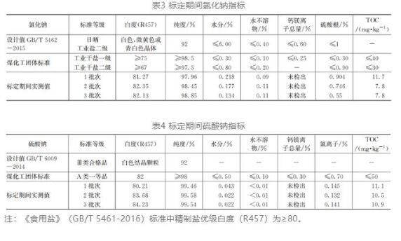 蒸發(fā)結(jié)晶單元常見(jiàn)工藝有MVR+結(jié)晶器及多效蒸發(fā)結(jié)晶方案。MVR方案相對(duì)節(jié)能,蒸汽壓縮機(jī)轉(zhuǎn)速較高,對(duì)動(dòng)、靜設(shè)備要求較高,MVR內(nèi)部結(jié)構(gòu)相對(duì)較復(fù)雜,設(shè)備結(jié)垢后不易清洗,一次投資較高;多效蒸發(fā)方案蒸汽消耗較大,設(shè)備內(nèi)部結(jié)構(gòu)簡(jiǎn)單,易清洗,操作簡(jiǎn)單。近零排放濃鹽水水質(zhì)復(fù)雜、易結(jié)垢堵塞,本項(xiàng)目地處淮河流域、環(huán)境敏感,如蒸發(fā)結(jié)晶系統(tǒng)不能長(zhǎng)周期穩(wěn)定運(yùn)行,一旦廢水無(wú)處去,將造成整個(gè)煤化工廠停產(chǎn)退料,同時(shí)考慮到石化企業(yè)低品質(zhì)蒸汽相對(duì)富裕,本項(xiàng)目最終采用了更穩(wěn)定易操作的多效蒸發(fā)方案作為蒸發(fā)結(jié)晶主工藝,在鹽側(cè)和硝側(cè)分別設(shè)置五效強(qiáng)制循環(huán)蒸發(fā)結(jié)晶系統(tǒng)。項(xiàng)目實(shí)際運(yùn)行后,納濾分鹽產(chǎn)水側(cè)氯化鈉占主導(dǎo),濃水測(cè)硫酸鈉占主導(dǎo),蒸發(fā)結(jié)晶單元操作難度大幅降低,多效蒸發(fā)系統(tǒng)設(shè)備結(jié)構(gòu)簡(jiǎn)單易操作,運(yùn)行也更平穩(wěn)。中安項(xiàng)目自2019年底打通全流程產(chǎn)出合格硫酸鈉和氯化鈉以來(lái)穩(wěn)定運(yùn)行至今,每年節(jié)省危廢處置費(fèi)用約4 000萬(wàn)。項(xiàng)目標(biāo)定期間共檢測(cè)3批次氯化鈉、硫酸鈉,各項(xiàng)指標(biāo)均優(yōu)于設(shè)計(jì)值。氯化鈉白度、水分、TOC、鈣鎂離子優(yōu)于煤化工團(tuán)體標(biāo)準(zhǔn)一級(jí)工業(yè)干鹽標(biāo)準(zhǔn),純度、水不溶物滿(mǎn)足二級(jí)工業(yè)干鹽標(biāo)準(zhǔn)硫酸根基本滿(mǎn)足二級(jí)工業(yè)干鹽標(biāo)準(zhǔn)。硫酸鈉3批次全部滿(mǎn)足煤化工團(tuán)體標(biāo)準(zhǔn)A類(lèi)一等品標(biāo)準(zhǔn),見(jiàn)表3和表4。