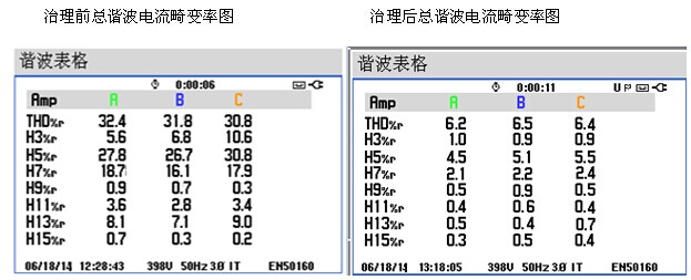 以下為西安某支行治理效果:ZAPF有源濾波器投入后,電流總畸變率從32.4%降低到6.2%,大大提高了電網(wǎng)的電能質(zhì)量,濾波效果明顯。