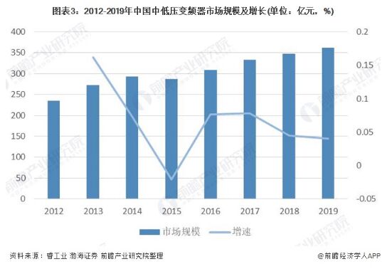圖表3:2012-2019年中國中低壓變頻器市場(chǎng)規(guī)模及增長(單位:億元,%)