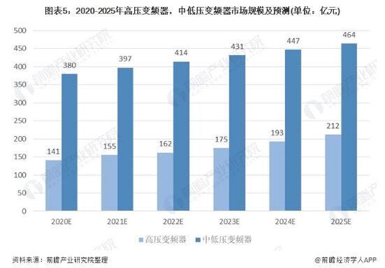 圖表5:2020-2025年高壓變頻器,中低壓變頻器市場(chǎng)規(guī)模及預(yù)測(cè)(單位:億元)