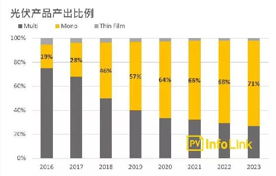 單晶產(chǎn)品持續(xù)強(qiáng)勢(shì)進(jìn)擊 2018年不僅有領(lǐng)跑者計(jì)劃的高單晶份額拉升國(guó)內(nèi)單晶占比、單晶PERC電池片效率也持續(xù)突飛猛進(jìn),造就18年成為單晶產(chǎn)品攻城略地的一年,市場(chǎng)單晶份額由2017年的28%進(jìn)展到2018年的46%。 展望2019年,單晶PERC主流組件瓦數(shù)可能在二季度即站上310W,與多晶組件仍以275W為多拉開了35W的顯著差距,也讓海內(nèi)外市場(chǎng)選擇單晶組件的比重更加提升。 且后續(xù)還有硅片薄化能夠幫助降本、電池片仍有空間提效率等等,再加上明年新一波的領(lǐng)跑者可能又會(huì)再次讓市場(chǎng)看到組件瓦數(shù)的躍進(jìn),P型單晶產(chǎn)品持續(xù)挾高性價(jià)比在明年強(qiáng)勢(shì)進(jìn)擊。