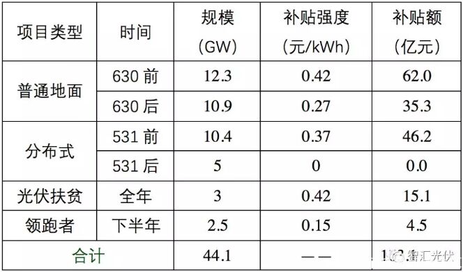 今日,國家能源局正式公布了2018年底的光伏累計(jì)裝機(jī)為17463萬kW,考慮到2017年底的光伏累計(jì)裝機(jī)為13025萬kW,則新增4411萬kW。結(jié)合國家能源局發(fā)布的數(shù)據(jù),不同時(shí)間段的裝機(jī)規(guī)模及補(bǔ)貼需求如下表所示。
