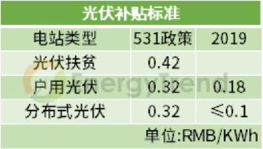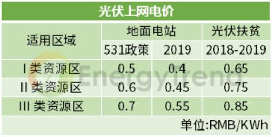 競(jìng)價(jià)配置項(xiàng)目 上網(wǎng)指導(dǎo)電價(jià):Ⅰ類(lèi)地區(qū)0.4元/千瓦時(shí)、Ⅱ類(lèi)地區(qū)0.45元/千瓦時(shí)、Ⅲ類(lèi)地區(qū)0.55元/千瓦時(shí)。 集中式 531政策后,由于暫不安排2018年普通光伏電站建設(shè)規(guī)模,以及2019年度光伏政策未下發(fā)的不確定下,目前一季度光伏裝機(jī)容量為2.4GW。 2019年度的集中式光伏電站上網(wǎng)電價(jià)通過(guò)市場(chǎng)競(jìng)爭(zhēng)方式確定,將三類(lèi)資源區(qū)集中式電站標(biāo)桿上網(wǎng)電價(jià)改為指導(dǎo)價(jià),不得超過(guò)所在資源區(qū)指導(dǎo)價(jià)。 工商業(yè)分布式 2019年7月開(kāi)始,工商業(yè)分布式光伏項(xiàng)目一律通過(guò)競(jìng)價(jià)方式進(jìn)行指標(biāo)配置,無(wú)論是“自發(fā)自用,余量上網(wǎng)”的還是“全額上網(wǎng)”的項(xiàng)目,市場(chǎng)競(jìng)爭(zhēng)形成的價(jià)格既不得超過(guò)指導(dǎo)價(jià)。 其中“自發(fā)自用,余電上網(wǎng)”的項(xiàng)目按全電量0.1元補(bǔ)貼,補(bǔ)貼標(biāo)準(zhǔn)也不得超過(guò)每千瓦時(shí)0.1元。 已明確規(guī)模項(xiàng)目 戶(hù)用光伏 2018年531政策中,能源局明確了分布式規(guī)模10GW,但在今年戶(hù)用單獨(dú)配置的情況下,根據(jù)2019年一季度分布式光伏總量2.8GW,按財(cái)政部30億的補(bǔ)貼中,戶(hù)用7.5億配置來(lái)看,戶(hù)用光伏在0.18元的高補(bǔ)貼,擬定3.5GW的裝機(jī)規(guī)模下,還是極具吸引力的。 光伏扶貧 由于光伏扶貧項(xiàng)目不在財(cái)政部下發(fā)的30億元補(bǔ)貼的大盤(pán)子中,按單獨(dú)補(bǔ)貼計(jì)算,剩下的22.5億元光伏補(bǔ)貼將流入競(jìng)價(jià)配置項(xiàng)目中。 而早些時(shí)候發(fā)布的“十三五”第二批光伏扶貧電站中提到,本次下達(dá)的光伏扶貧項(xiàng)目原則上應(yīng)在2019年底前全容量建成并網(wǎng),“十三五”第一批光伏扶貧項(xiàng)目須在2019年6月30日(含)前全容量建成并網(wǎng)。未按期建成并網(wǎng)的項(xiàng)目視為自動(dòng)放棄,不再納入國(guó)家光伏扶貧目錄。 結(jié)合國(guó)家能源局第二批光伏扶貧電站下達(dá)的1.67GW裝機(jī)規(guī)模,加上2017年公布第一批扶貧電站4.2GW的裝機(jī)規(guī)模中未并網(wǎng)的項(xiàng)目,在上網(wǎng)電價(jià)仍維持每千瓦時(shí)0.65元、0.75元、0.85元執(zhí)行的情況下,光伏扶貧項(xiàng)目需求動(dòng)能已全面開(kāi)啟。