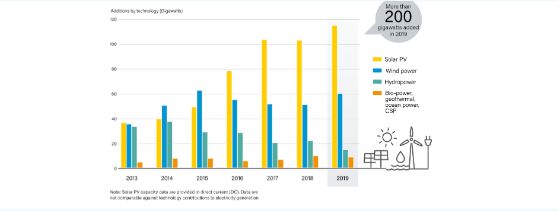 近日,全球可再生能源權(quán)威平臺——REN21發(fā)布了《 2020年全球可再生能源狀況報(bào)告》(GSR2020)。報(bào)告稱,2019年全球新增可再生能源裝機(jī)容量超過200GW,其中光伏占比最高,新增裝機(jī)量達(dá)到115GW,同比增長12%。截止至2019年底,光伏累計(jì)裝機(jī)容量達(dá)到627GW。