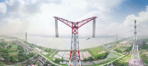 4月15日,這是導(dǎo)線展放后的昌古特高壓長(zhǎng)江大跨越工程北岸跨越塔。當(dāng)天,世界電壓等級(jí)最高的特高壓大跨越——昌古特高壓長(zhǎng)江大跨越工程全線貫通。