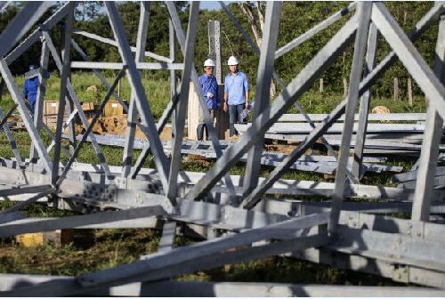 2月14日,在巴西納雄耐爾港,山東電建一公司員工楊官輝(左)和武曉成在施工現(xiàn)場(chǎng)工作。彼時(shí),巴西美麗山水電站特高壓輸電工程二期項(xiàng)目第五標(biāo)段建設(shè)正在納雄耐爾港有序進(jìn)行。