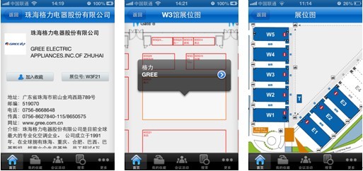 (五)參展名單&展位圖 在“參展名單”中可查看所有參展企業(yè)的會(huì)刊信息。點(diǎn)開(kāi)任意一家展商名稱,該公司的名稱、地址、電話、傳真、網(wǎng)址和簡(jiǎn)介便一目了然(見(jiàn)圖7)。點(diǎn)擊該公司的展位號(hào),將自動(dòng)跳轉(zhuǎn)到“展位圖”頁(yè)面,顯示出該公司的具體方位(見(jiàn)圖8)。通過(guò)“展位圖”您可以看到W1-W5,E1-E3八個(gè)展廳的展臺(tái)具體分布情況,實(shí)現(xiàn)對(duì)目標(biāo)展商的快速定位。(見(jiàn)圖9)