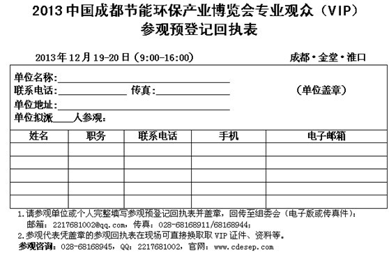 四川省環(huán)境保護(hù)產(chǎn)業(yè)協(xié)會(huì)、四川省環(huán)境和資源綜合利用協(xié)會(huì)、成都工業(yè)經(jīng)濟(jì)聯(lián)合會(huì)、成都表面工程行業(yè)協(xié)會(huì)等川內(nèi)專業(yè)協(xié)會(huì)團(tuán)體同期召開年會(huì)及技術(shù)交流會(huì),組織會(huì)員單位參展參觀。 參展參觀免費(fèi) 往返班車接送 參觀觀眾可通過大會(huì)官網(wǎng)進(jìn)行參觀預(yù)登記(www.cdesep.com/cang.shtml),或填寫“參觀預(yù)登記回執(zhí)表”蓋章并按表格下方要求回傳至組委會(huì),或帶名片至展會(huì)現(xiàn)場換取相關(guān)證件。