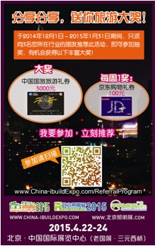 分享分享,送您旅游大獎! 為感謝眾多業(yè)內人士對本展會的關注與支持,并將北京智能建筑展的概念持續(xù)傳播,展會主辦方特推出“ 分享分享,送您旅游大獎 之”計劃。 于2014年12月1日-2015年1月31日期間,只須向3名您所在行業(yè)的朋友推薦此活動,即可參加抽獎,贏取中國國旅旅游禮券3000元! 另每周也有機會贏得京東購物禮券100元,趕快參加,不容錯過! 參加請登入:http://www.China-ibuildExpo.com/ReferralProgram