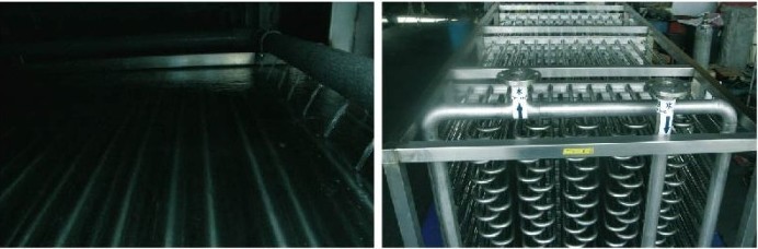 一般蓄冰槽在盤管內(nèi)側(cè)循環(huán)鹵水,盤管外儲水結(jié)冰于管壁,由于靜止蓄冰與鹵水熱交換為傳導(dǎo)熱傳模式,因此儲冰效率不佳。在溶冰初期,鹵水管與結(jié)冰間管壁冰迅速溶冰成水后逐漸形成鹵水與冰間的靜止水層,成為熱阻抗而使溶冰效率減緩,甚至在溶冰末期雖有剩余冰量,卻無法使用的現(xiàn)象。